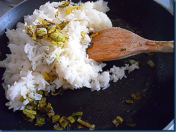 Ανακατεύουμε το ρύζι με τα μυρωδικά απαλά να ενωθούν.